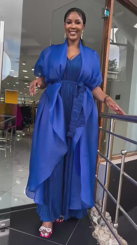 Make a bold entrance in our Royal Blue Pleated Jumpsuit & Jacket Set. This elegant two-piece features a beautifully pleated wide-leg jumpsuit paired with a matching flowy open-front jacket for a refined, effortless look. Designed for comfort and style, it offers graceful movement and a flattering silhouette perfect for weddings, parties, special events, and church. A timeless statement set that brings elegance to any occasion.